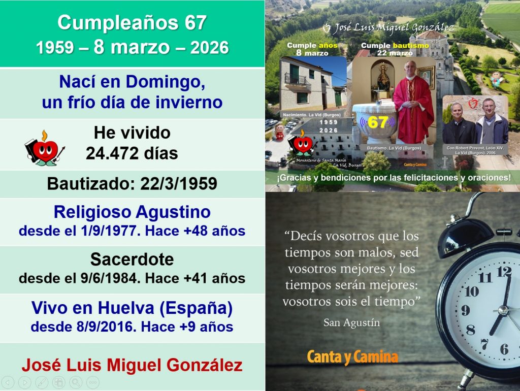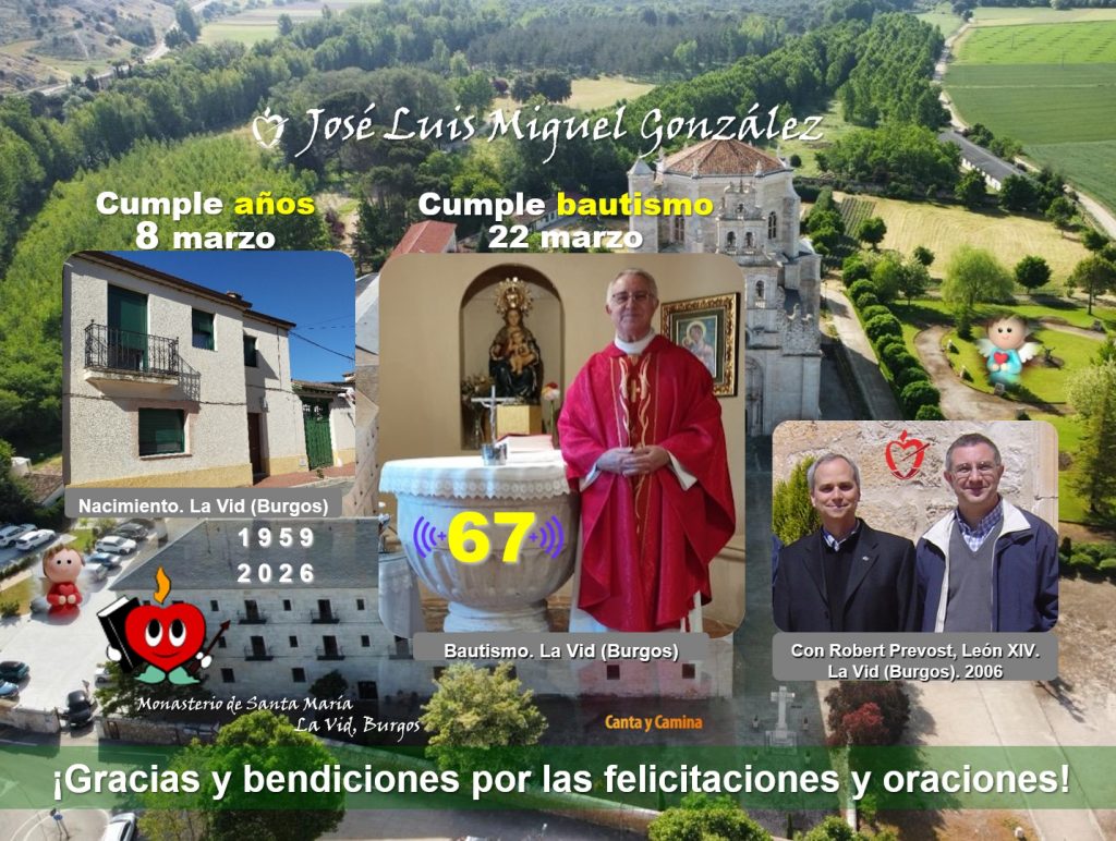 Celebrar la vida como vocación, peregrino de esperanza, es hermoso y gratificante. Mi fecha de nacimiento fue el 8 de marzo de 1959, una «mañana buena» de domingo, en La Vid (Burgos), España. Un «pueblo nuevo» castellano formado con habitantes de Linares del Arroyo (Segovia), emigrados con «la marca del agua» por la construcción de un pantano.
