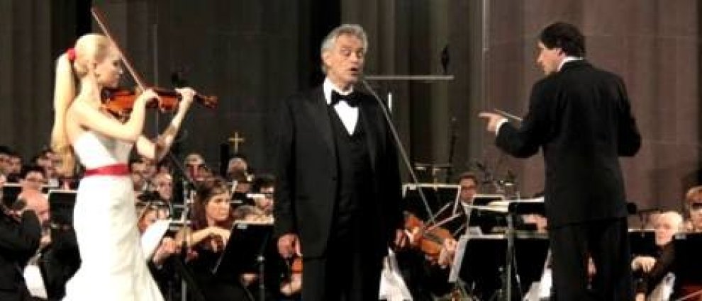 Andrea Bocelli canta en la Sagrada Familia, junto a la violinista Anastasiaya Petryshak y el director Marcello Rota foto de Fabian Hochscheid.