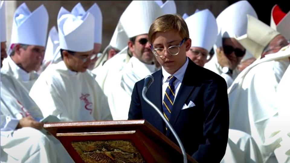 Estaba toda la familia de Carlo. También sus dos hermanos, que son mellizos: Fracesca y Michele, de 15 años. Nacieron en 2010, cuatro años después de la muerte de Acutis. Su hermano leyó la primera lectura en inglés.