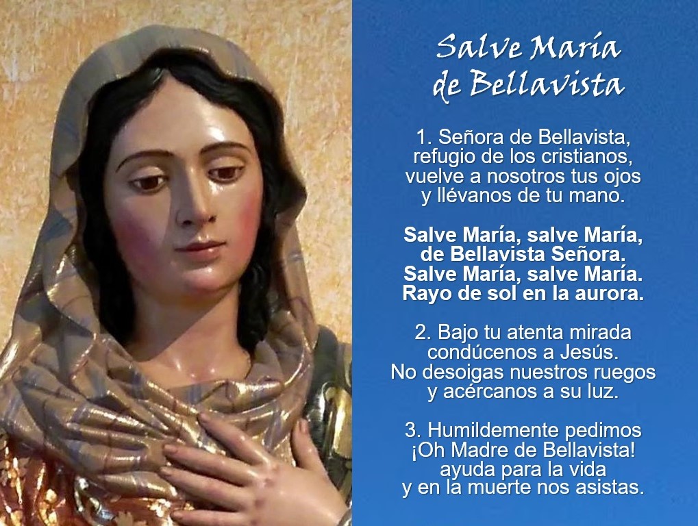 Imagen de Nuestra Señora de Bellavista, escultura obra de Elías Rodríguez Picón. La canción Salve María de Bellavista es una adaptación de Senhora, um dia descestes – Coro do Santuário de Fátima.