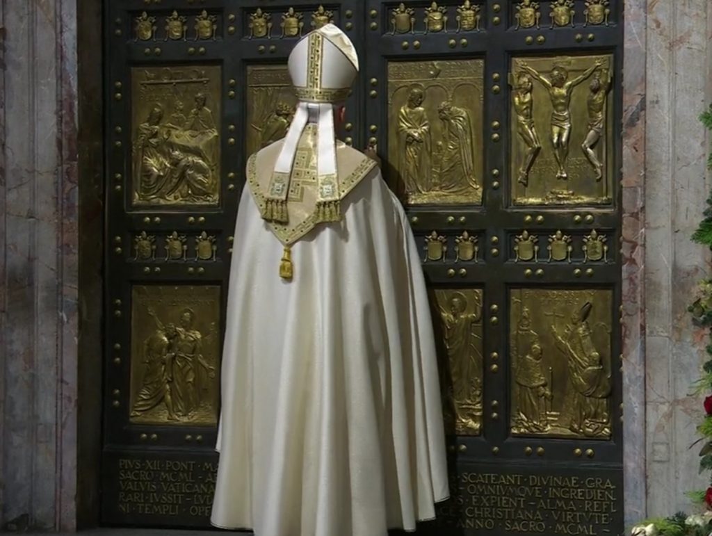 El Papa en oración debajo de la Puerta Santa (@Vatican Media)