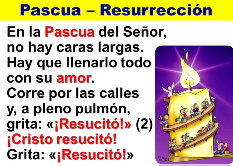 En la Pascua del Señor no hay caras largas. Hay que llenarlo todo con su amor. Corre por las calles y a pleno pulmón: Grita: ¡Resucitó! Grita: ¡Resucitó! ¡Cristo resucitó! Grita: ¡Resucitó!